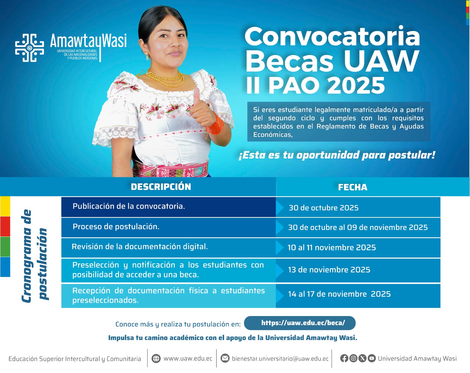 Somos la Universidad Intercultural de las Nacionalidades y Pueblos Indígenas, a través de nuestra propuesta educativa reconocemos, valoramos, promovemos y potenciamos los conocimientos y sabidurías de las nacionalidades y pueblos indígenas, afroecuatoriano y montubio, que son los destinatarios prioritarios de este proyecto.